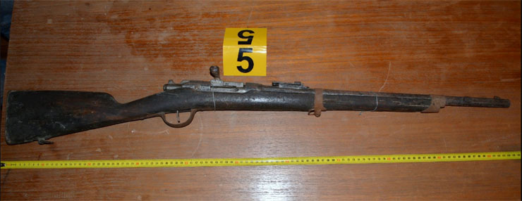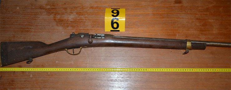 • ένα (1) μη λειτουργικό πολεμικό τυφέκιο, μονόκαννο συνολικού μήκους 1,02 μέτρων με αναγραφόμενο ένδειξη πάνω στο κοντάκι «12 G» και με τις ενδείξεις «S. 1878 και 46829» εκατέρωθεν της κάνης,