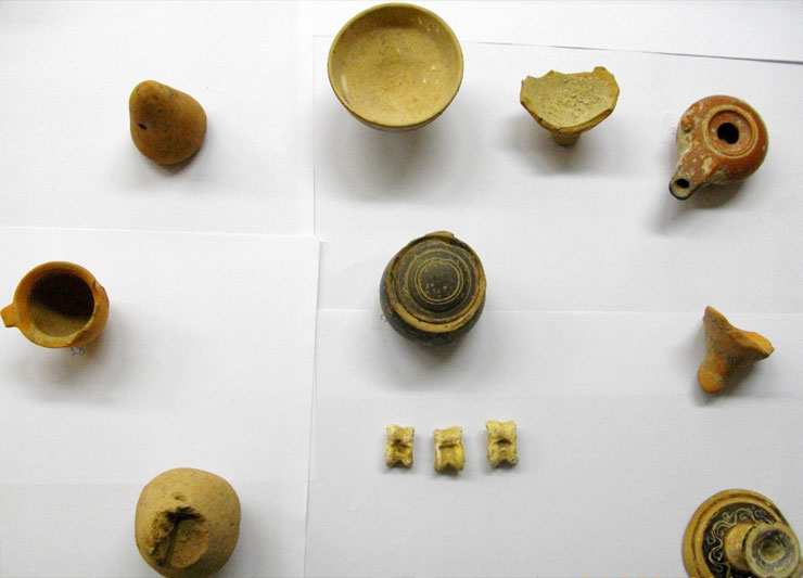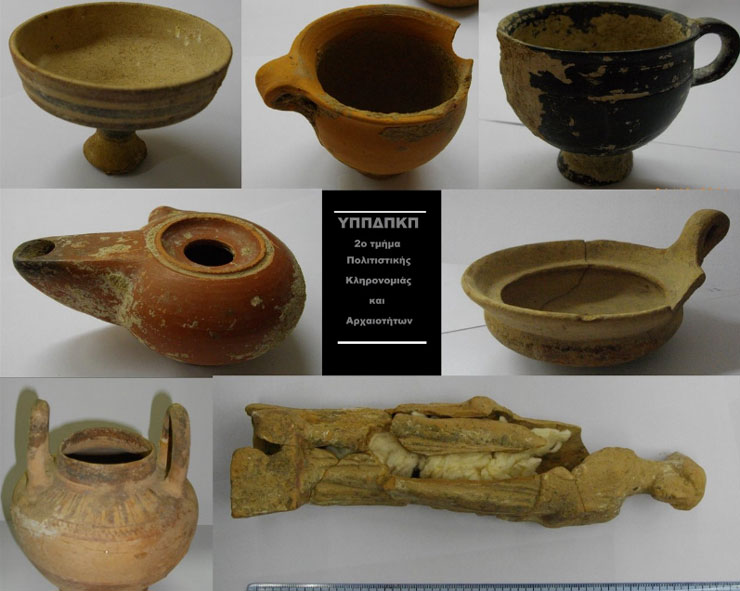 • ένα (1) μόνωτο αγγείο συγκολλημένο από δύο τμήματα σπασμένο σε μικρό τμήμα του χείλους το οποίο ενδεχομένως φέρει ίχνη γραπτής διακόσμησης στο σημείο του ώμου ύψους 5 εκατοστών και ενδεχομένως χρονολογείται στην κλασσική-ύστερη κλασσική περίοδο,