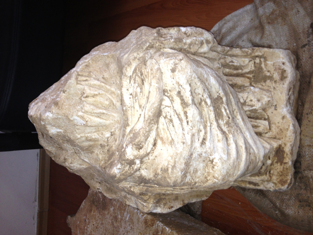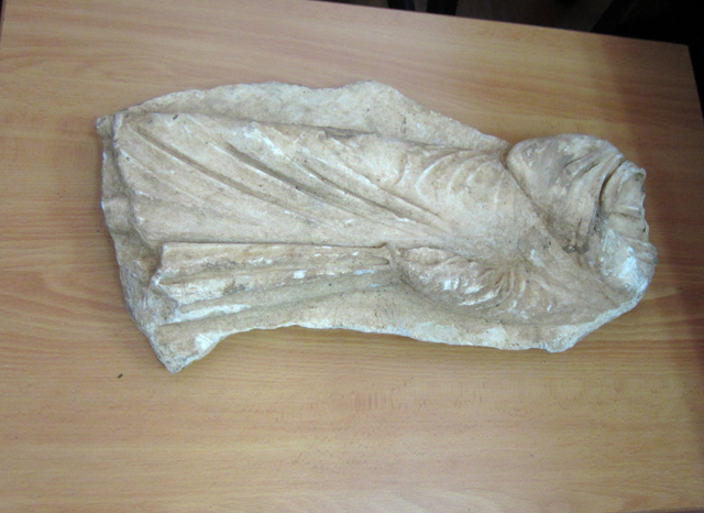 – Απότμημα μαρμάρινου αγάλματος καθιστής μορφής, πιθανόν ελληνιστικών- ρωμαϊκών χρόνων. Σώζεται το κάτω τμήμα του σώματος μέχρι τη μέση. Η μορφή κάθεται σε θρόνο και πατά σε βάση. Το συνολικό ύψος είναι 0,45 μ., το πλάτος 0,32 μ. και πάχος 0,30 μ.