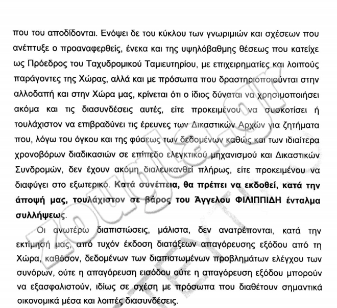 »Τα ανωτέρω, καθιστούν το πρόσωπο αυτό όχι μόνον ύποπτο φυγής, από το χρονικό σημείο κατά το οποίο θα διαπιστώσει ότι τα συγκεντρωθέντα σε βάρος του στοιχεία από την Δικαιοσύνη θα μπορούσαν να κριθούν ικανά να τον οδηγήσουν στην φυλακή, αλλά και ύποπτο τέλεσης νέων εγκλημάτων ή παρέμβασης και αλλοίωσης της πραγματικής κατάστασης (λ.χ. με την μετακίνηση χρηματικών ποσών, την απόκρυψή και, εν τέλει, ανάσχεση του εκκρεμούς ελέγχου της Δικαιοσύνης), πράγμα πιθανολογούμενο και από τα ιδιαίτερα χαρακτηριστικά των πράξεων που του αποδίδονται. Ενόψει δε του κύκλου των γνωριμιών και σχέσεων που ανέπτυξε ο προαναφερθείς, ένεκα και της υψηλόβαθμης θέσεως που κατείχε ως Πρόεδρος του Ταχυδρομικού Ταμιευτηρίου, με επιχειρηματίες και λοιπούς παράγοντες της Χώρας, αλλά και με πρόσωπα που δραστηριοποιούνται στην αλλοδαπή και στην Χώρα μας, κρίνεται ότι ο ίδιος δύναται να χρησιμοποιήσει ακόμα και τις διασυνδέσεις αυτές, είτε προκειμένου να συσκοτίσει ή τουλάχιστον να επιβραδύνει τις έρευνες των Δικαστικών Αρχών για ζητήματα που, λόγω του όγκου και της φύσεως των δεδομένων καθώς και των ιδιαίτερα χρονοβόρων διαδικασιών σε επίπεδο ελεγκτικού μηχανισμού και Δικαστικών Συνδρομών, δεν έχουν ακόμη διαλευκανθεί πλήρως, είτε προκειμένου να διαφύγει στο εξωτερικό. Κατά συνέπεια, θα πρέπει να εκδοθεί, κατά την άποψή μας, τουλάχιστον σε βάρος του Αγγέλου Φιλιππίδη ένταλμα συλλήψεως» τονίζει η Πόπη Παπανδρέου.