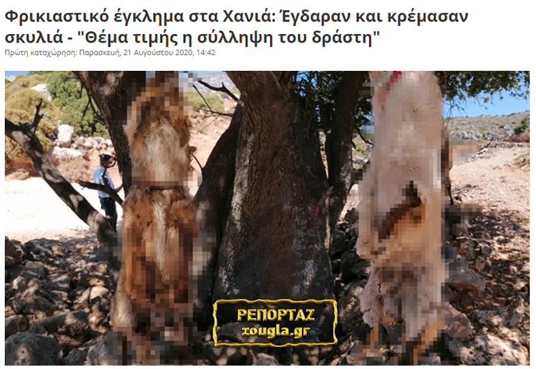 Υπενθυμίζεται ότι τα σκυλιά είχαν βρεθεί κρεμασμένα, γδαρμένα, έχοντας υποστεί έντονη κακοποίηση και βασανισμό.