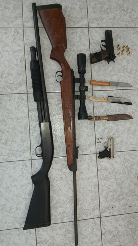 Κατά τη διάρκεια των ερευνών βρέθηκαν και κατασχέθηκαν συνολικά: δύο πιστόλια με τους γεμιστήρες τους, ένα κυνηγετικό όπλο, ένα αεροβόλο όπλο με διόπτρα, τρία μαχαίρια και 63 φυσίγγια.
