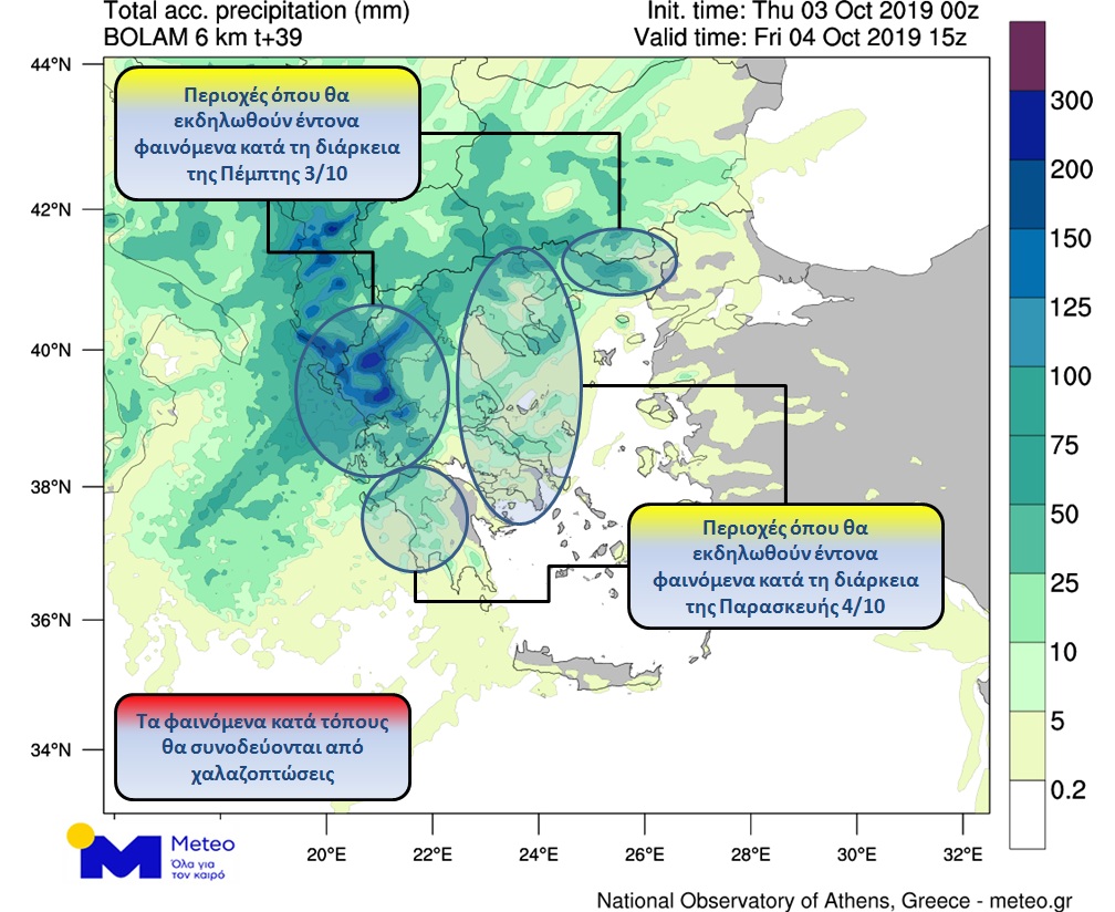 Σημειώνεται πως σε πολλές περιοχές (ιδιαίτερα στην Ήπειρο και τη δυτική Στερεά Ελλάδα) τα έντονα φαινόμενα αναμένεται να σημειωθούν σε μεγάλη έκταση και για σχετικά μεγάλο χρονικό διάστημα, με αποτέλεσμα ο κίνδυνος εκδήλωσης πλημμυρικών φαινομένων να είναι πολύ αυξημένος. Οι καταιγίδες, ενδέχεται να συνοδεύονται και από χαλαζοπτώσεις.