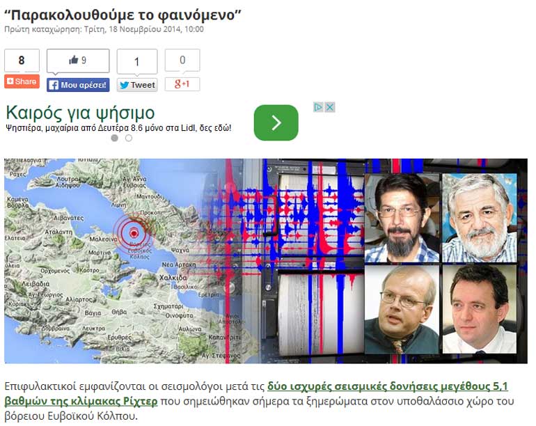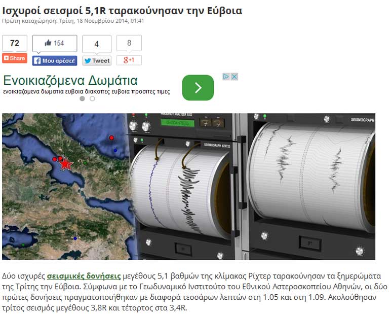 Στις 18 Νοεμβρίου 2014 είχαν σημειωθεί δύο ισχυρές σεισμικές δονήσεις 5,1 βαθμών της κλίμακας Ρίχτερ στον υποθαλάσσιο χώρο του βόρειου Ευβοϊκού Κόλπου. Το επίκεντρο των δονήσεων ήταν το ίδιο και οι σεισμοί πραγματοποιήθηκαν με διαφορά τεσσάρων λεπτών.