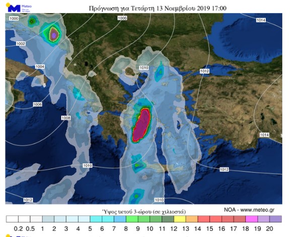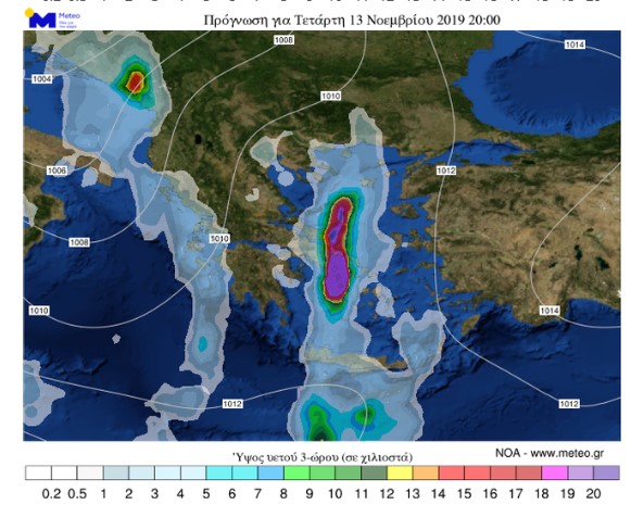 Μάλιστα, από τις μεσημεριανές προς απογευματινές ώρες όλα τα στοιχεία συνηγορούν στον σχηματισμό μιας σημαντικής σε έκταση ζώνης σύγκλισης από το Κεντρικό έως το Νοτιοδυτικό Αιγαίο, όπου θα εκδηλωθούν βροχές και καταιγίδες ιδιαίτερα μεγάλης κατά τόπους έντασης. Η ζώνη αυτή σταδιακά θα κινηθεί προς τα ανατολικά, επηρεάζοντας την Εύβοια, τις Κυκλάδες, την Κρήτη και το βράδυ τα Δωδεκάνησα.