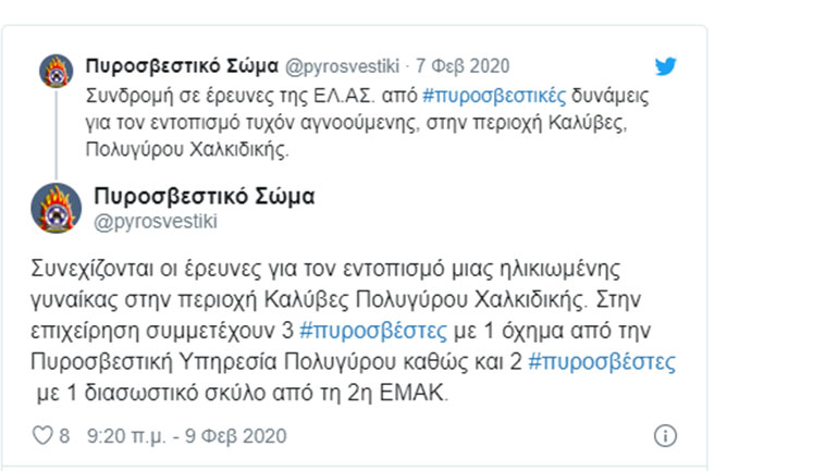 Στις έρευνες που συνεχίζονται και σήμερα Κυριακή συμμετέχουν τρεις πυροσβέστες με ένα όχημα από την Πυροσβεστική Υπηρεσία Πολυγύρου καθώς και δύο Πυροσβέστες με έναν διασωστικό σκύλο από τη 2η ΕΜΑΚ.