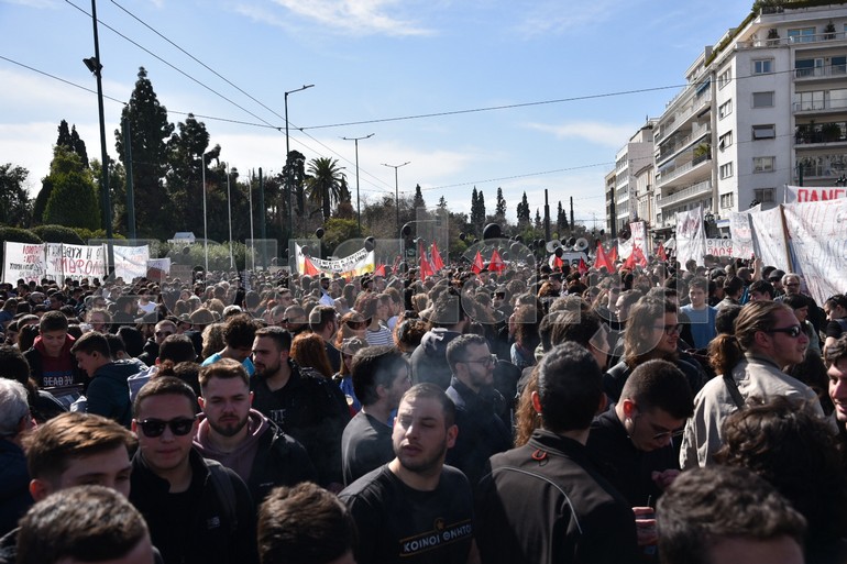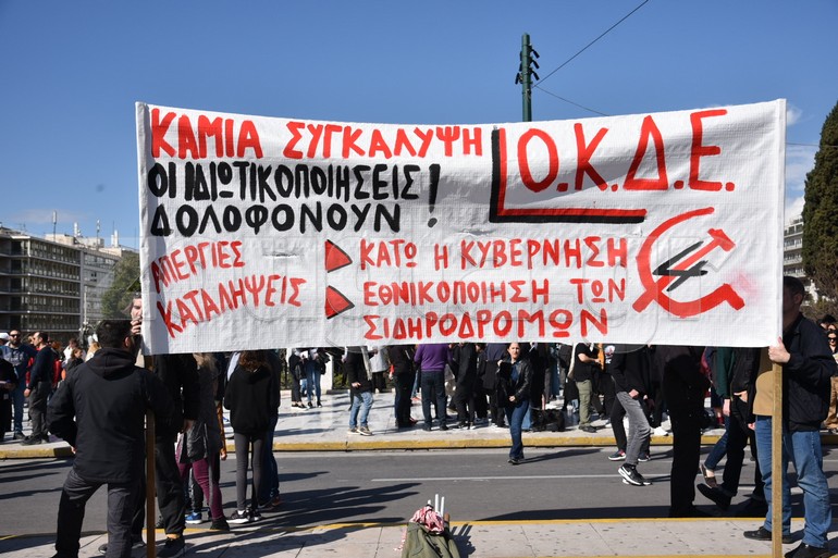Στο κάλεσμα του Σωματείου Εργαζομένων στον σιδηρόδρομο ανταποκρίθηκε πλήθος κόσμου. Oι διαδηλωτές καταλαμβάνουν τη Βασιλίσσης Αμαλίας, την Όθωνος και μπροστά από το ξενοδοχείο «Μεγάλη Βρετάνια».