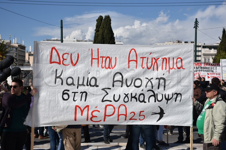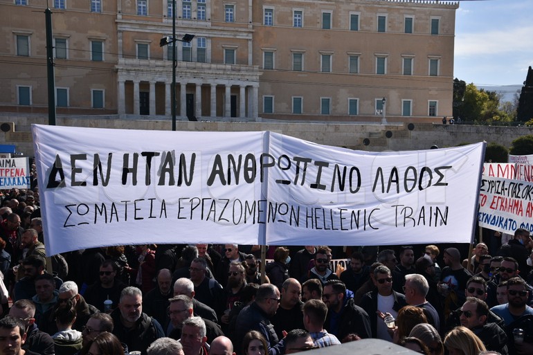 Πριν την έναρξη της συγκέντρωσης απλώθηκε ένα μεγάλο πανό μπροστά στη Βουλή το οποίο έγραφε τα εξής: «Κυβερνήσεις, Hellenic Train και ΟΣΕ είναι οι βασικοί εγκληματικοί κλειδούχοι» με υπογραφή Εργατικά Κέντρα, Ομοσπονδίες, Σωματεία και μαζικοί φορείς.