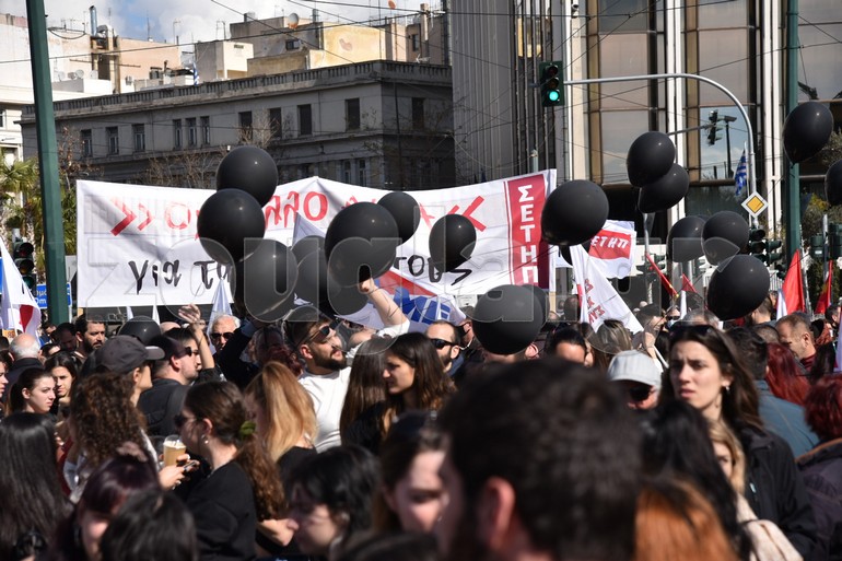 Ολοκληρώθηκε στο Σύνταγμα το μεγάλο συλλαλητήριο για τα θύματα της πολύνεκρης σιδηροδρομικής τραγωδίας στα Τέμπη.