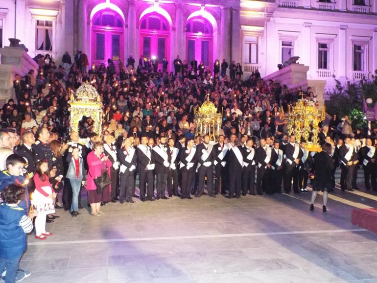 Χιλιάδες πιστοί, μόνιμοι κάτοικοι και επισκέπτες του νησιού, κατέκλυσαν την πλατεία Μιαούλη και τους γύρω δρόμους για να παρακολουθήσουν την περιφορά των Επιταφίων των Ιερών Ναών Μεταμορφώσεως του Σωτήρος, Κοιμήσεως Θεοτόκου και Αγίου Νικολάου.