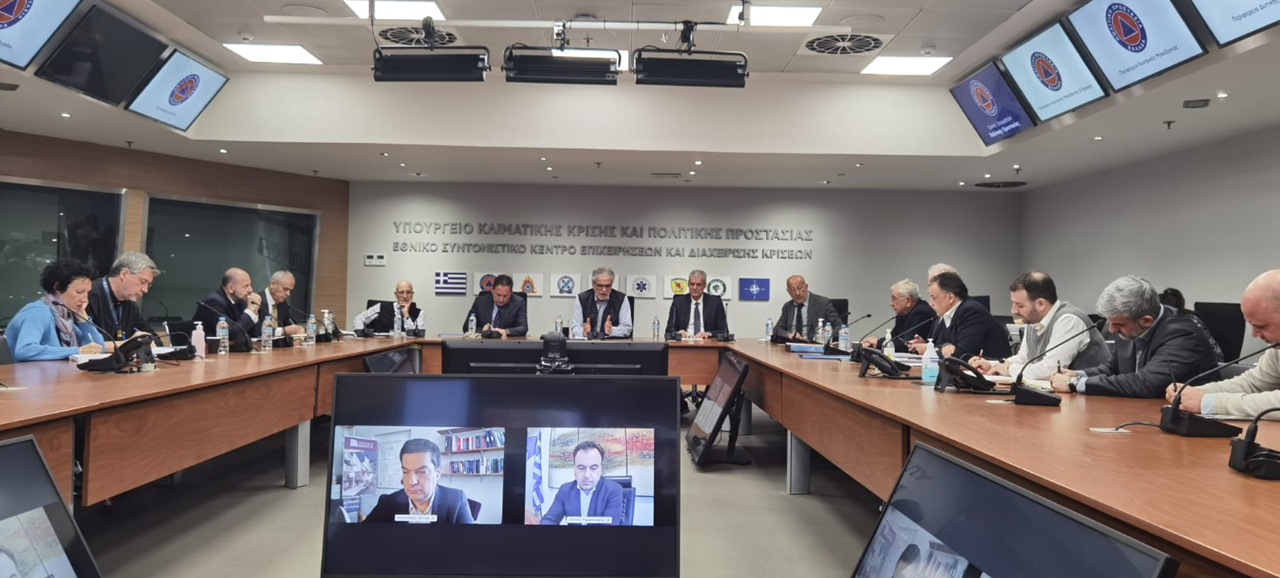Η σύσκεψη πραγματοποιήθηκε υπό τον υπουργό Χρήστο Στυλιανίδη, με τη συμμετοχή του αναπληρωτή υπουργού Εσωτερικών Στέλιου Πέτσα, του υφυπουργού Κλιματικής Κρίσης και Πολιτικής Προστασίας Ευάγγελου Τουρνά, του υφυπουργού Χωροταξίας και Αστικού Περιβάλλοντος Νικόλαου Ταγαρά και του γενικού γραμματέα Πολιτικής Προστασίας Βασίλειου Παπαγεωργίου.