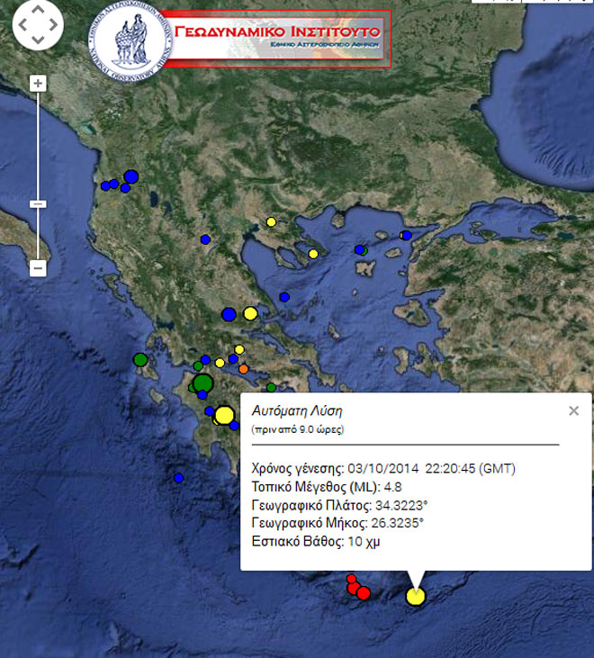 Όπως ανακοίνωσε το Γεωδυναμικό Ινστιτούτο του Εθνικού Αστεροσκοπείου Αθηνών, οι σεισμογράφοι τους κατέγραψαν την ασθενή σεισμική δόνηση μεγέθους 4,8 βαθμών της κλίμακας Ρίχτερ σε απόσταση 445 χιλιομέτρων νότια νοτιοανατολικά της Αθήνας.