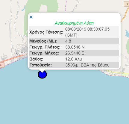 Παράλληλα, σεισμός σημειώθηκε και ανοιχτά της Σάμου, στα παράλια της Τουρκίας. Η δόνηση ήταν μεγέθους 4,8 Ρίχτερ και 12 χιλιόμετρα βάθος αλλά 35 χλμ. από το ελληνικό νησί.