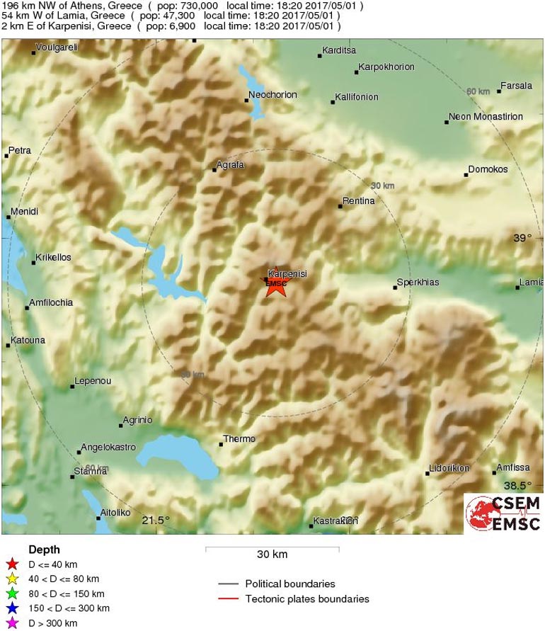 Το επίκεντρο εντοπίστηκε 23 χιλιόμετρα βορειοανατολικά του Καρπενησίου και το εστιακό βάθος υπολογίζεται στα 5 χιλιόμετρα.