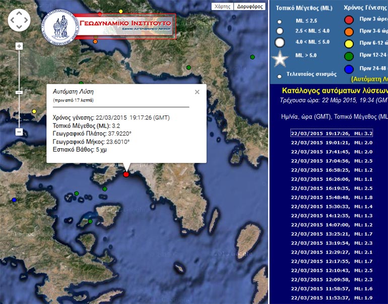 Σεισμική δόνηση μεγέθους 3,2 βαθμών της κλίμακας Ρίχτερ σημειώθηκε στις 21.17 το βράδυ της Κυριακής στον θαλάσσιο χώρο μεταξύ Πειραιά και Σαλαμίνας.