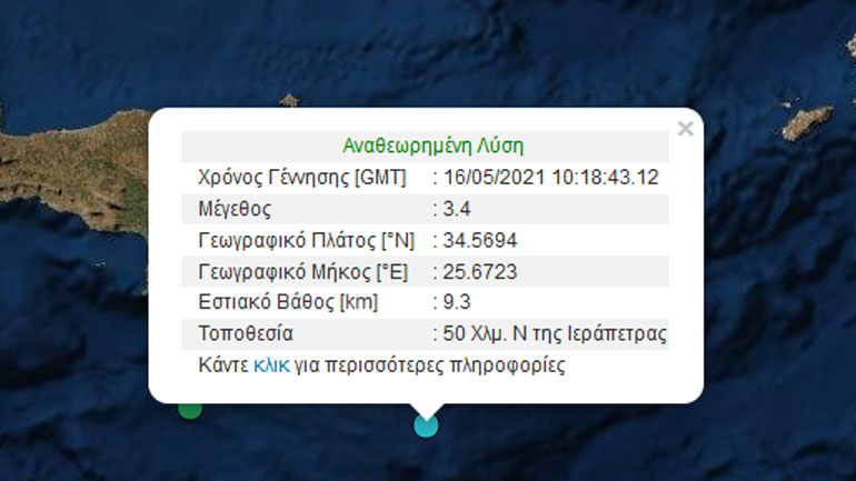 Σεισμική δόνηση μεγέθους 3,4 βαθμών της κλίμακας Ρίχτερ σημειώθηκε στην Ιεράπετρα. Ο σεισμός έγινε 50 χλμ., νότια της Ιεράπετρας. Το εστιακό βάθος είναι 9.3 χλμ.....