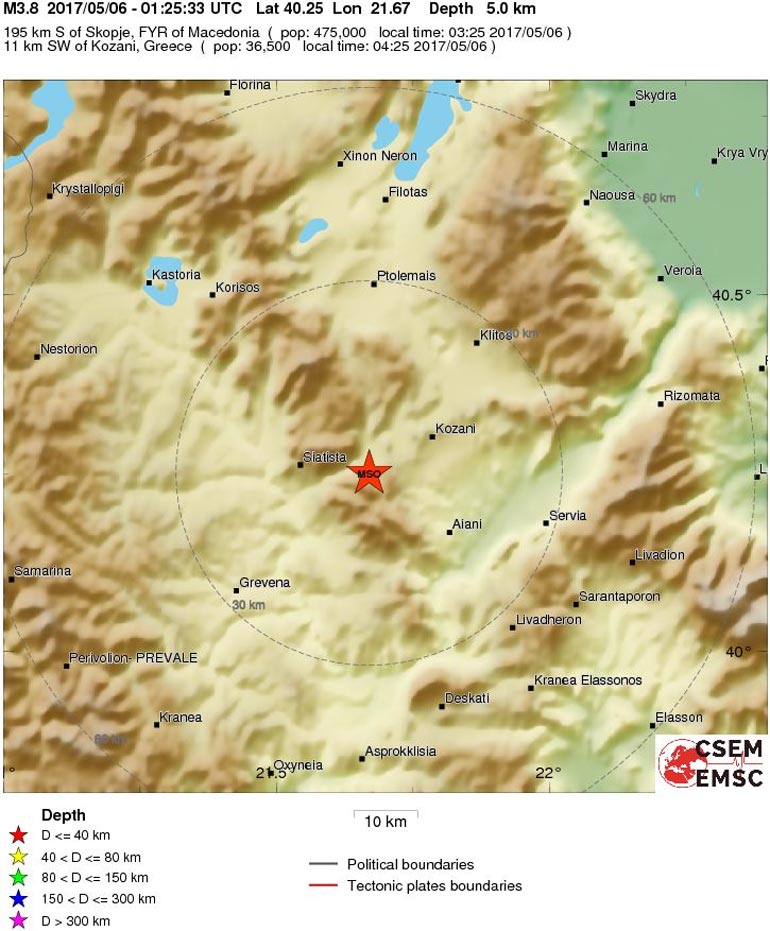 Το επίκεντρο εντοπίστηκε 15 χιλιόμετρα νοτιοδυτικά της Κοζάνης και το εστιακό βάθος υπολογίζεται στα 10 χιλιόμετρα.