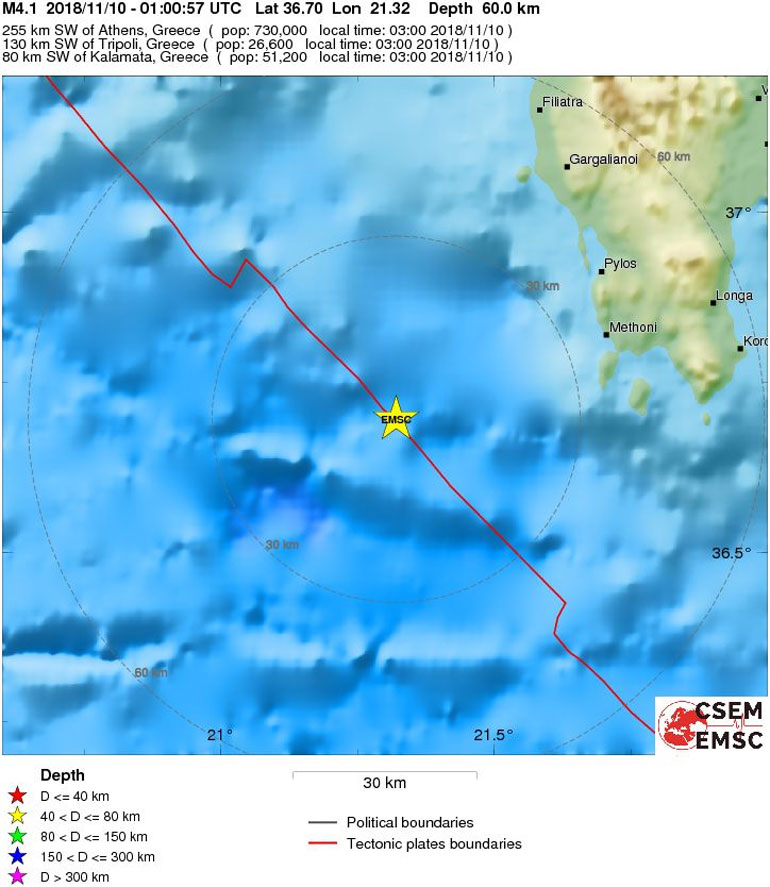 Σύμφωνα με το Ευρωπαϊκό-Μεσογειακό Σεισμολογικό Κέντρο, η δόνηση ήταν μεγέθους 4,1 βαθμών της κλίμακας Ρίχτερ, είχε επίκεντρο 80 χλμ. νοτιοδυτικά της Καλαμάτας και εστιακό βάθος 60 χλμ.