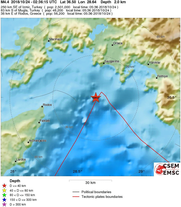 Το επίκεντρο του σεισμού ορίζεται 56 χλμ. ανατολικά της Ρόδου και το εστιακό του βάθος μετρήθηκε στα 5 χλμ.