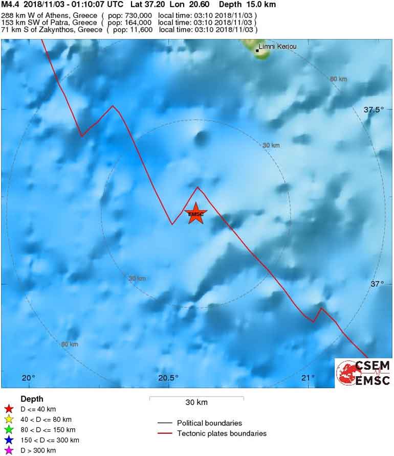 Σύμφωνα με το Ευρωπαϊκό-Μεσογειακό Σεισμολογικό Κέντρο, η δόνηση ήταν μεγέθους 4,4 βαθμών της κλίμακας Ρίχτερ, είχε επίκεντρο 75 χλμ. νότια της Ζακύνθου και εστιακό βάθος 15 χλμ.