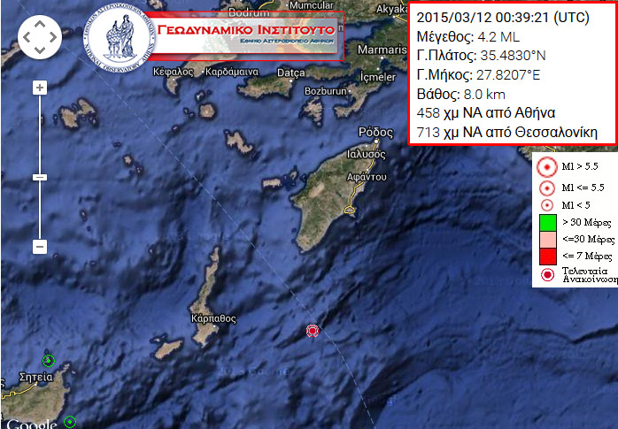 Σεισμός μεγέθους 4,2 βαθμών της κλίμακας Ρίχτερ σημειώθηκε στις 02.39 τα ξημερώματα σε θαλάσσιο χώρο ανοικτά της Καρπάθου, σύμφωνα με την επίσημη ανακοίνωση του Γεωδυναμικού Ινστιτούτου του Εθνικού Αστεροσκοπείου Αθηνών.
