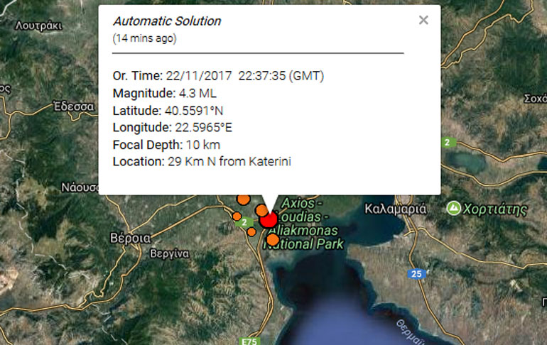 Το επίκεντρο της δόνησης ορίζεται στα 29χλμ. βόρεια της Κατερίνης και το εστιακό της βάθος μετρήθηκε στα 2 χλμ.