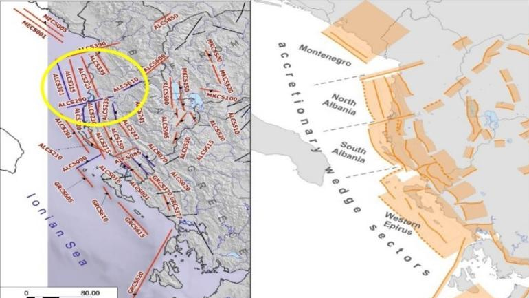 Στον χάρτη: Αριστερά τα ενεργά ρήγματα Αλβανίας και Δυτικής Ελλάδος, ως σεισμογενετικές πηγές, ως γραμμικά στοιχεία και δεξιά ως “επίπεδα” (ζώνες). Το Ανάστροφο Ρήγμα Δυρραχίου (Dures) με κωδικό ALCS301 και το αντιθετικό του ALCS 325, όπως προκύπτει από τα πρώτα σεισμολογικά δεδομένα ενεργοποιήθηκαν στον πρόσφατο σεισμό, καθώς επίσης και άλλα μικρότερα ρήγματα της ίδιας γεωτεκτονικής δομής.