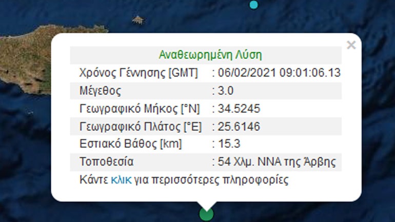 Σεισμική δόνηση μεγέθους 3 Ρίχτερ σημειώθηκε το πρωί του Σαββάτου νότια-νοτιοανατολικά της Άρβης, σύμφωνα με τις μετρήσεις του Γεωδυναμικού Ινστιτούτου.