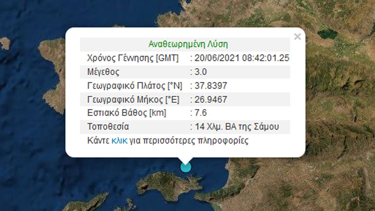 Σεισμική δόνηση μεγέθους 3 βαθμών της κλίμακας Ρίχτερ σημειώθηκε 14 χλμ., βορειοανατολικά της Σάμου. Το εστιακό βάθος είναι 7.6 χλμ., σύμφωνα με το Γεωδυναμικό Ινστιτούτο.