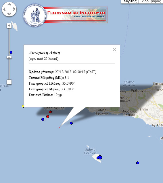 Σεισμική δόνηση μεγέθους 3,1 βαθμών της κλίμακας Ρίχτερ σημειώθηκε στις 04.32 τα ξημερώματα σε θαλάσσια περιοχή νότια της Παλαιόχωρας Χανίων, σύμφωνα με προκαταρκτική εκτίμηση του Γεωδυναμικού Ινστιτούτου του Εθνικού Αστεροσκοπείου Αθηνών.