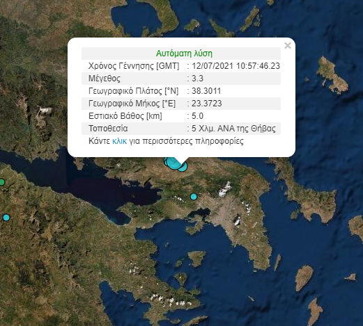 Νέα σεισμική δόνηση μεγέθους 3,3 βαθμών της κλίμακας Ρίχτερ έγινε στις 13:57 στην περιοχή της Θήβας.