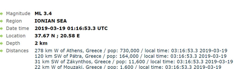 Σεισμική δόνηση μεγέθους 3,4 βαθμών της κλίμακας Ρίχτερ σημειώθηκε στις 03.16 τα ξημερώματα της Τρίτης σε υποθαλάσσια περιοχή του Ιονίου Πελάγους, νοτιοδυτικά της Ζακύνθου.