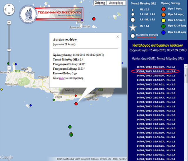 Σεισμική δόνηση 3,4 βαθμών της κλίμακας Ρίχτερ σημειώθηκε στις 03.18 τα ξημερώματα σε θαλάσσια περιοχή νότια – νοτιοδυτικά της Ιεράπετρας, σύμφωνα με προκαταρκτική εκτίμηση του Γεωδυναμικού Ινστιτούτου του Εθνικού Αστεροσκοπείου Αθηνών.