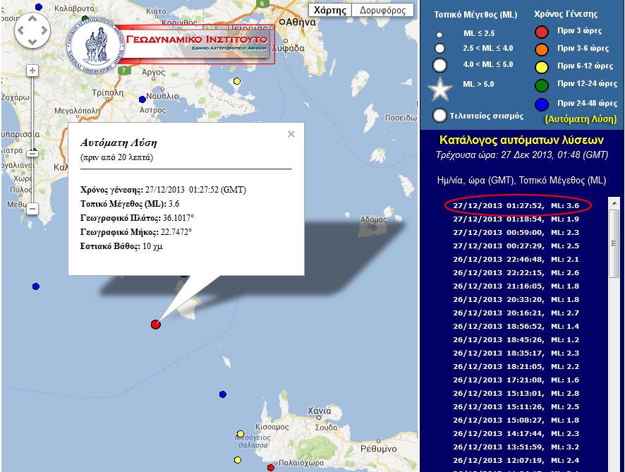 Σεισμική δόνηση μεγέθους 3,6 βαθμών της κλίμακας Ρίχτερ σημειώθηκε στις 03.27 τα ξημερώματα σε θαλάσσια περιοχή δυτικά των Κυθήρων, σύμφωνα με προκαταρκτική εκτίμηση του Γεωδυναμικού Ινστιτούτου του Εθνικού Αστεροσκοπείου Αθηνών.