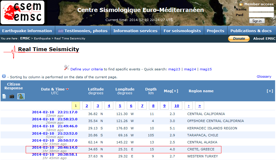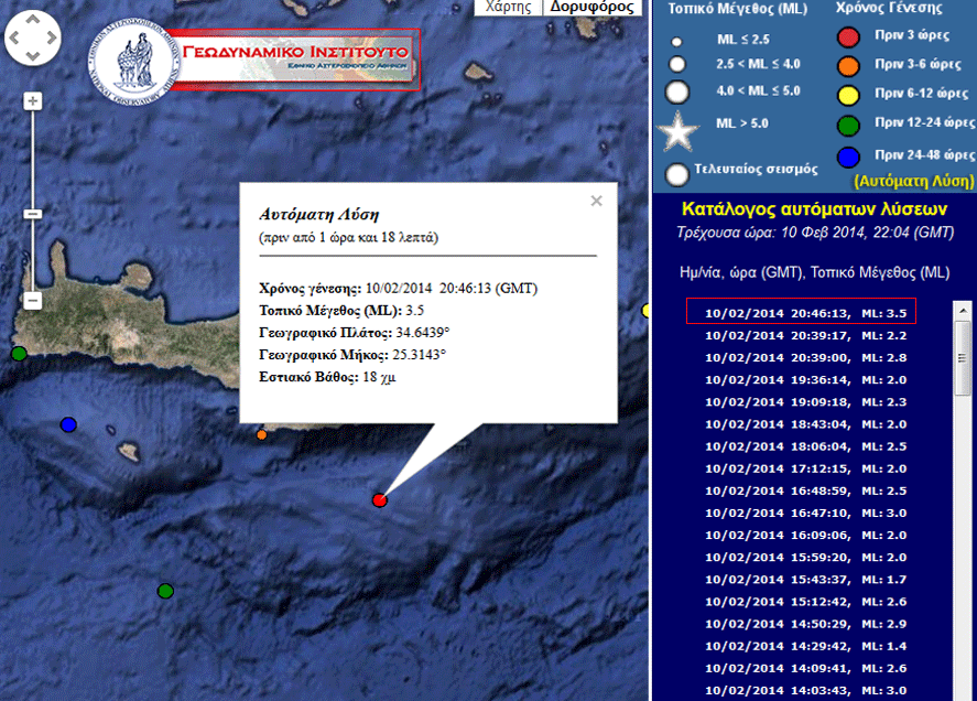 Σεισμική δόνηση 3,5 βαθμών της κλίμακας Ρίχτερ σημειώθηκε στις 22.46 το βράδυ της Δευτέρας σε θαλάσσιο χώρο νότια της Κρήτης.