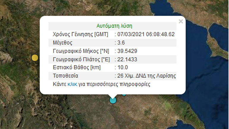 Σεισμός 3.6 Ρίχτερ δυτικά της Λάρισας