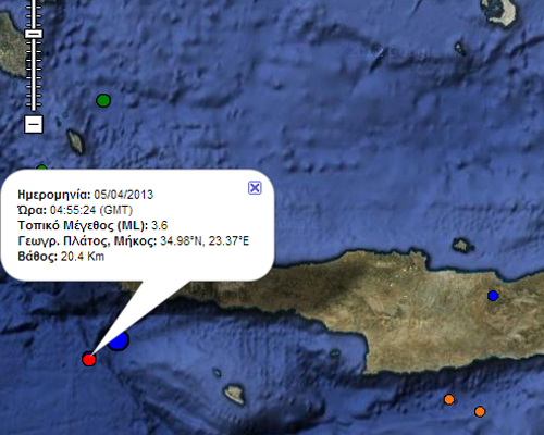 Σεισμική δόνηση της τάξης των 3,6 βαθμών της κλίμακας Ρίχτερ σημειώθηκε σήμερα λίγο πριν τις 08.00 το πρωί στο θαλάσσιο χώρο νότια – νοτιοδυτικά της Κρήτης.