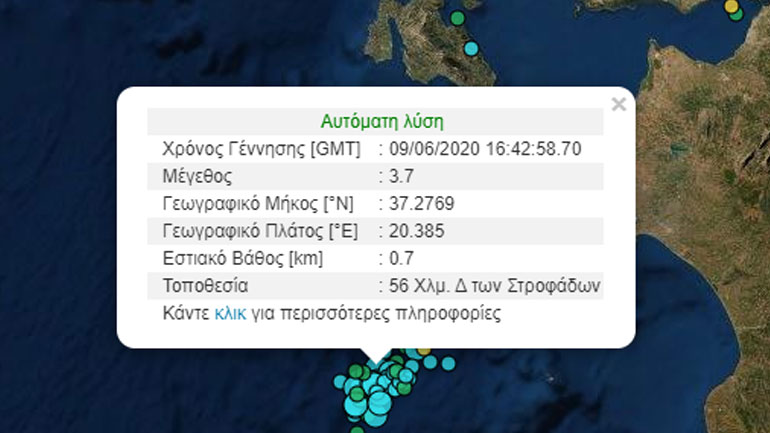 Η δόνηση είχε εστιακό βάθος που υπολογίζεται στα 0,7 χλμ και επίκεντρο που εντοπίζεται στα 56 χλμ δυτικά των Στροφάδων.