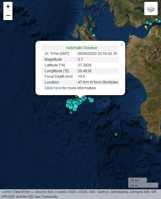 Η δόνηση είχε εστιακό βάθος που υπολογίζεται στα 10 χλμ και επίκεντρο που εντοπίζεται στα 47 χλμ δυτικά των Στροφάδων.