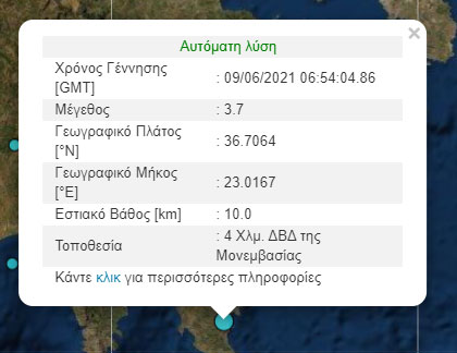 Σεισμός 3,7 Ρίχτερ σημειώθηκε στη Μονεμβασιά, λίγο πριν τις 10:00 το πρωί της Τετάρτης...
