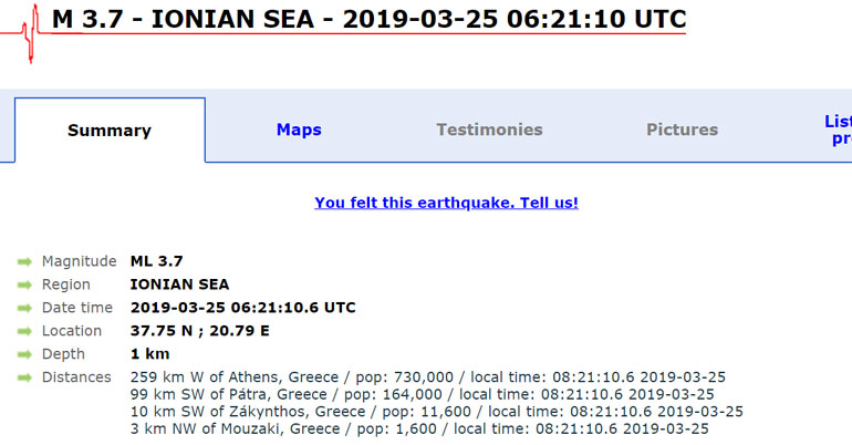 Ο σεισμός ήταν επιφανειακός και το επίκεντρό του εντοπίζεται 10 χιλιόμετρα νοτιοδυτικά της Ζακύνθου.