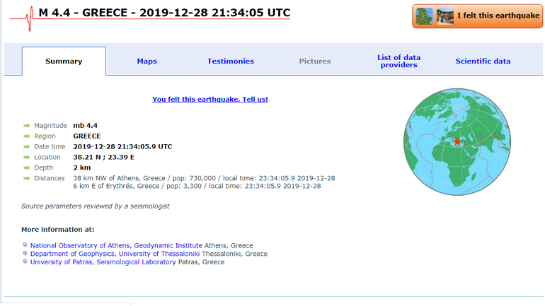 Σεισμική δόνηση μεγέθους 4,4  της  κλίμακας Ρίχτερ σημειώθηκε στις 23:34 σε απόσταση 39 χιλιομέτρων βορειοδυτικά των Αθηνών στο χωριό Ερυθρές. Ο σεισμός είχε εστιακό βάθος 2 χιλιομέτρων, σύμφωνα με το ευρωμεσογειακό Ινστιτούτο. Δεν έχουν αναφερθεί καταστροφές στο  Αστυνομικό Τμήμα Ερυθρών και την Πυροσβεστική αν και ο σεισμός έγινε αισθητός σε μεγάλο μέρος της Αττικής.