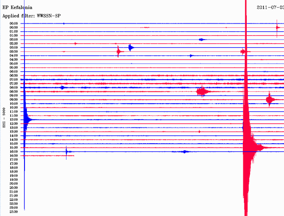 Δείτε πώς κατέγραψε τη δόνηση ο σεισμογράφος του Γεωδυναμικού Ινστιτούτου του Εθνικού Αστεροσκοπείου Αθηνών που είναι εγκατεστημμένος στην Κεφαλλονιά.