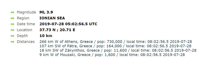 Το επίκεντρο του σεισμού εντοπίζεται 18 χιλιόμετρα νοτιοδυτικά της Ζακύνθου και το εστιακό του βάθος υπολογίζεται στα 10 χλμ.