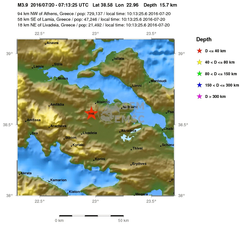 Ασθενής σεισμική δόνηση, μεγέθους 3,9 βαθμών της κλίμακας Ρίχτερ, σημειώθηκε στις 10.13 το πρωί της Τετάρτης στην περιοχή της Αταλάντης.