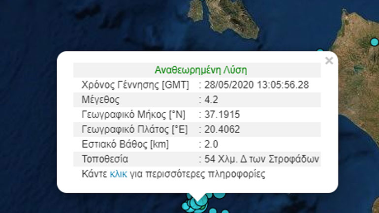 Ακολούθησε δόνηση 3 Ρίχτερ σε βάθος 10 χλμ και επίκεντρο στα 31 χλμ δυτικά-βορειοδυτικά των Στροφάδων.
