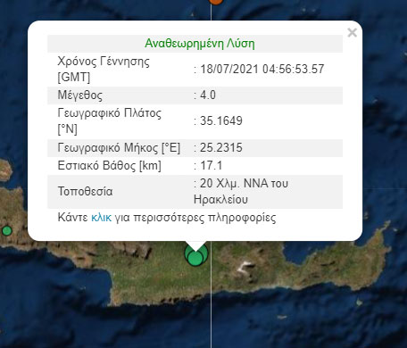 Σεισμική δόνηση μεγέθους 4 βαθμών της κλίμακας Ρίχτερ σημειώθηκε στις 7:56 το πρωί κοντά στην πόλη του Ηρακλείου στην Κρήτη.