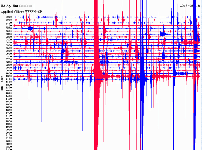 Δείτε τις δονήσεις που κατέγραψε ο σεισμογράφος του Γεωδυναμικού Ινστιτούτου του Εθνικού Αστεροσκοπείου Αθηνών που είναι εγκατεστημένος στον Άγιο Χαράλαμπο