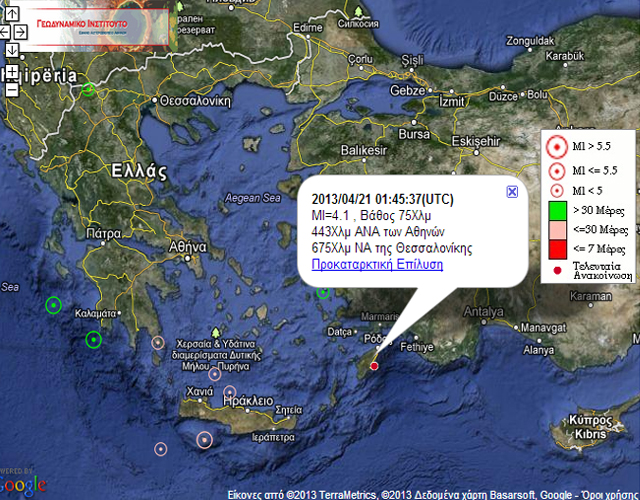 Σεισμική δόνηση 4,1 βαθμών της κλίμακας Ρίχτερ σημειώθηκε στη 01.45 μετά τα μεσάνυχτα, ώρα Ελλάδος, σε θαλάσσιο χώρο νότια νοτιοδυτικά της νήσου Ρόδου, σύμφωνα με προκαταρκτική εκτίμηση του Γεωδυναμικού Ινστιτούτου του Εθνικού Αστεροσκοπείου Αθηνών.