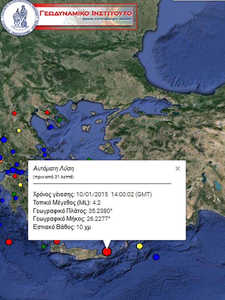 Σεισμική δόνηση μεγέθους 4,2 βαθμών της κλίμακας Ρίχτερ σημειώθηκε στις 4:00 το απόγευμα τoυ Σαββάτου στη Σητεία της Κρήτης.